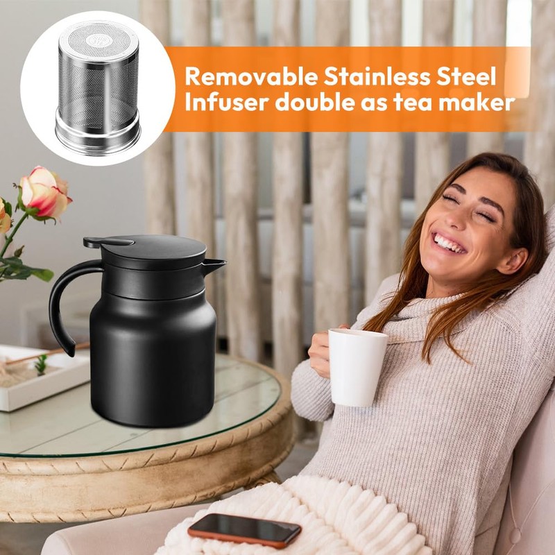 Peelanmall 1 Litre Thermos Flask, Small Thermos Flask, Double-Walled Stainless Steel Insulated Jug with Anti-scald Protection, Black Teapot for Hot Coffee and Tea, Perfect for Travel, Home, Office