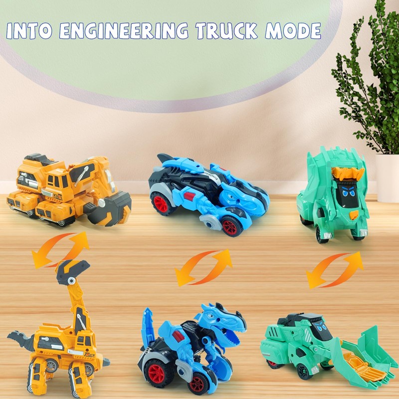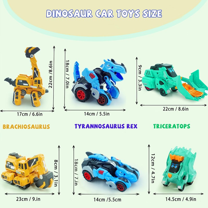 - 【3 Set Dinosaur Cars】3 different unique design. Tyrannosaurus rex transforming to car, Triceratops transforming to vehicle bulldozer, Brachiosaurus transforming to vehicle excavator. Our dino cars can help your baby learn more about dinosaur and car knowledge while having fun.