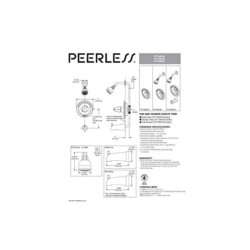 - Must order Peerless tub and shower valve rough with pressure-balance cartridge (PTR188700) separately to complete the unit