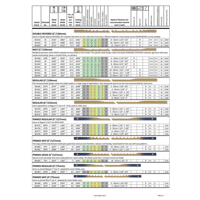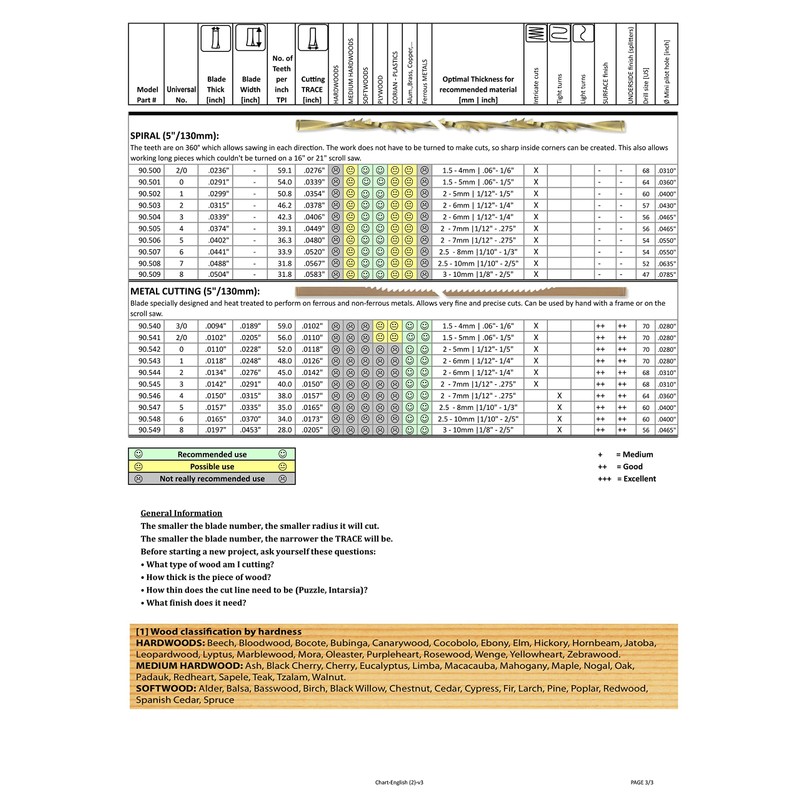 - The Charts shown are a BASE for people who wants to begin scrolling and don't know which blade to select for their project, based on the wood type to cut [1], the thickness of it [2], the pattern [3], the expected finish [4] or the hole size to drill for inside cuts [5].With the experience, the scroller will have their own preferences, which maybe different from our recommendations.