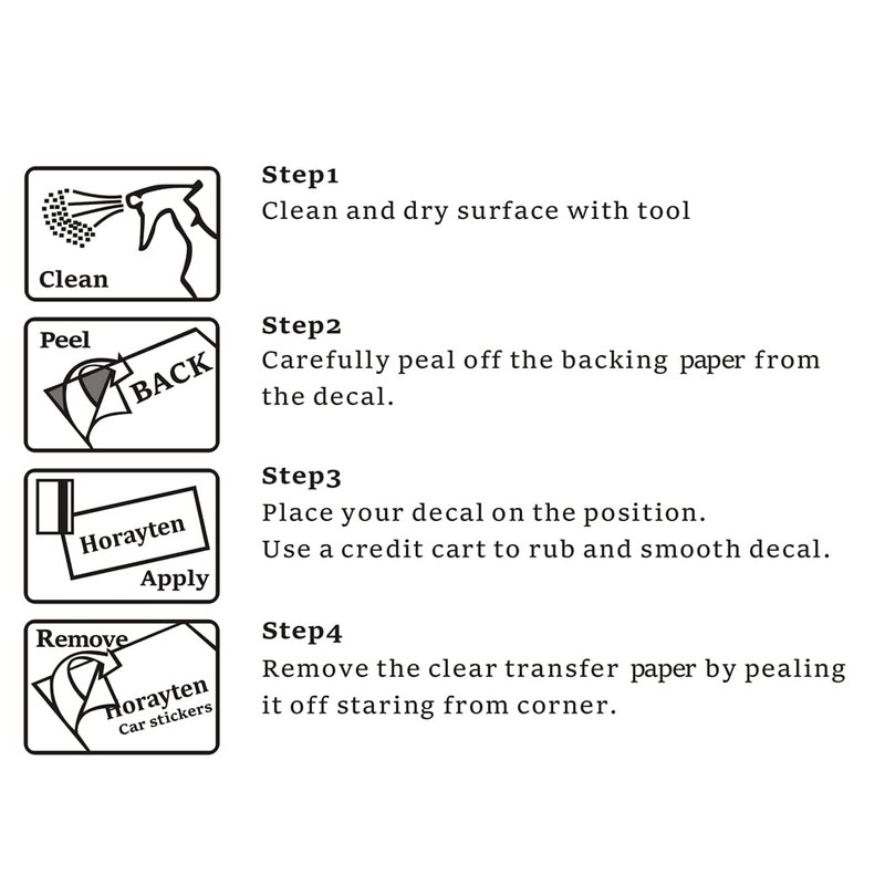 - Fácil de instalar. Limpia la superficie antes de usar la calcomanía. Simplemente pela y pega.