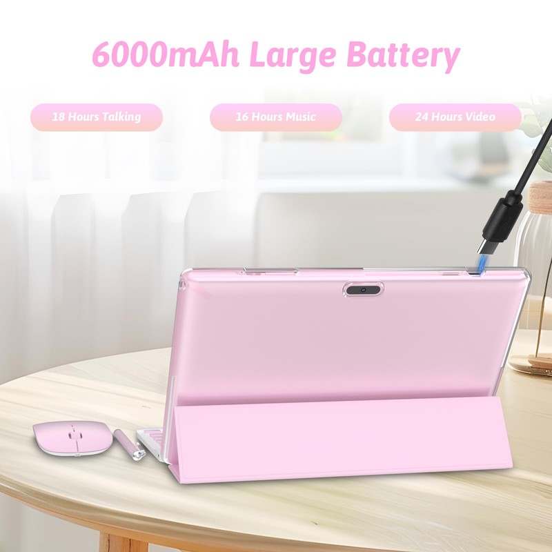 - 【Portable 2 in 1 Tablet with Keyboard】 This 10.1 inch android tablet equipped with a bluetooth keyboard, wireless mouse, and stylus as well as a foldable protective case, allowing you to seamlessly transform your 10'' tablet into a laptop-style device. This versatility makes it the ideal device for those who need to be productive on the go, whether it be for work, study, or play.