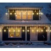 - WARM WHITE SNOWFLAKE DESIGN: 144 LEDs on 14 strands with large and small snowflakes create a layered icicle effect. The soft warm white light adds cozy, inviting charm to rooftops, windows, fences, or balconies.