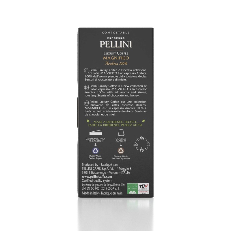 - 100% ARABICA COFFEE: Pellini Magnifico Italian espresso capsules contain an exclusive espresso coffee recipe with a full aroma of chocolate and honey, along with a complex and rich flavor.