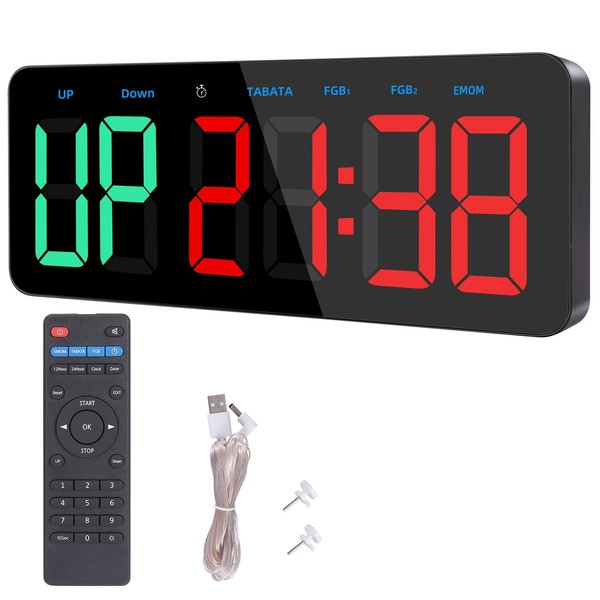 PELLOR Gym Timer Clock, Interval Timer with Function Mode Display, Countdown/UP Stopwatch Adjustable Brightness with Remote Control, 3'' Large Digits Digital Wall Clock for Home Gym Room