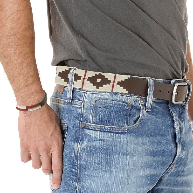 PELPE Argentine Leather Belt with Matching Lanyard and Leather Bracelet Embroidered Leather Belt for Men and Women Polo Argentina Belts, Beige-Red, 100 cm