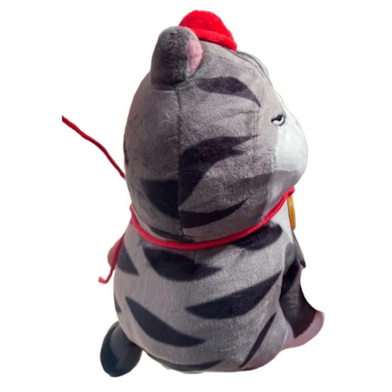 - DISEÑO ADORABLE: Peluche de gato gris con rayas negras, gorro rojo y medallón dorado, perfecto como decoración o compañero de juegos