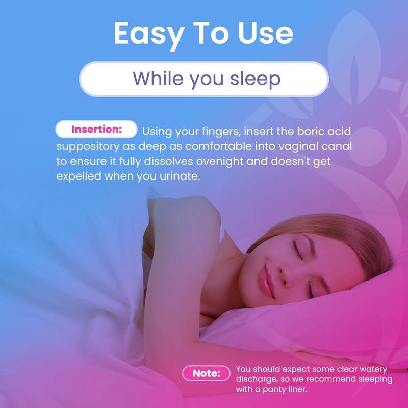 - INSERTION: Insert the boric acid suppository as deep as comfortable into the vaginal canal to ensure it fully dissolves overnight and doesn't get expelled when you urinate.