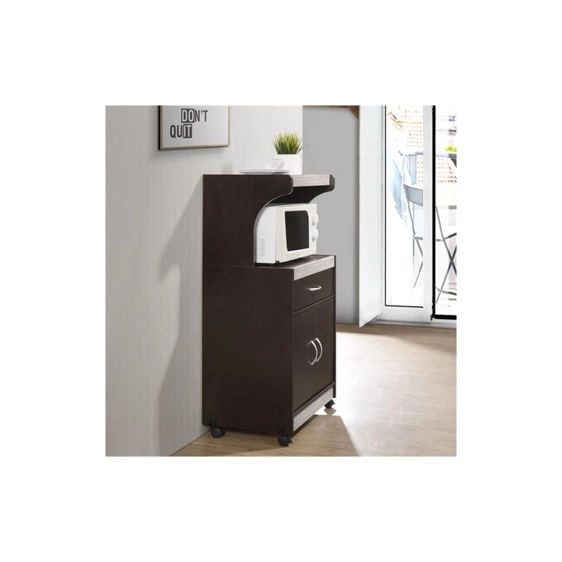 Contemporary and functional, this microwave cart is the perfect solution for your kitchen storage needs. The large open storage space at the center houses your microwave. The top shelf can be used to store your toaster oven. It has an enclosed cabinet space which provides compact kitchen storage for small kitchen appliances, pots and pans. It features a drawer for utensil storage. This microwave cart features wheels, which allows for easy mobility if necessary. It is made of wood, which ensures strength and durability.