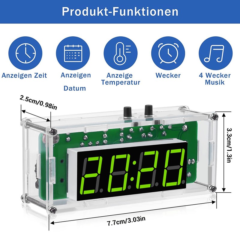 - 【Light-controlled temperature clock kit】: the practical soldering kit is used to install a 4-digit digital light-controlled temperature LED electronic clock. The current date (year, month, day, week), time, temperature in real time, alarm clock music. The user can set the alarm according to their needs. The brightness can be adjusted automatically or manually.