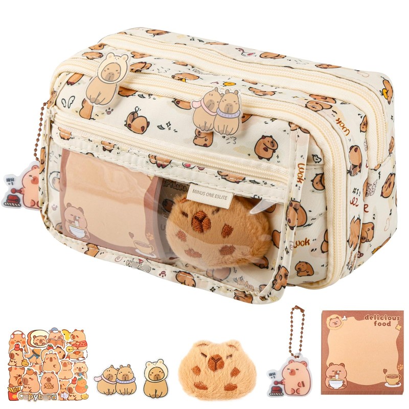 Pencil Case, Capy Pencil Case, Transparent Theme Stationery Comes with 1 Doll 20 Theme Stickers 2 Brooches and Pendants Images Pencil Pouch for Stationery Cosmetics Toiletry Storage