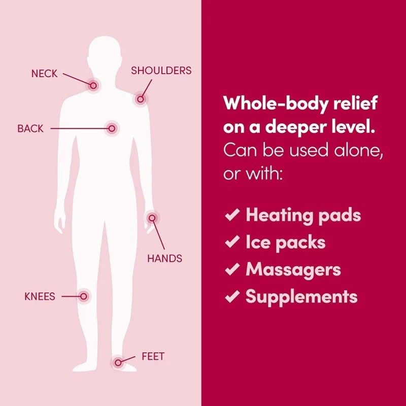 • Compatibilidad: Puede usarse sola o de manera segura en conjunto con otras terapias como almohadillas térmicas, compresas frías, masajes o suplementos.