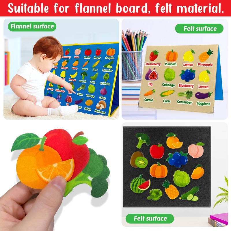 - Fruits and Vegetables Learning: 30 common fruits and vegetables, 32 words felt piece for young children