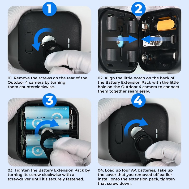 - Long-Lasting: Constructed with a durable high-impact plastic case, the battery extension packs are built to withstand the elements, making it ideal for outdoor use. Insert the four included batteries, pair with Outdoor 4 (Not included), and mount anywhere inside or outside of your home with ease