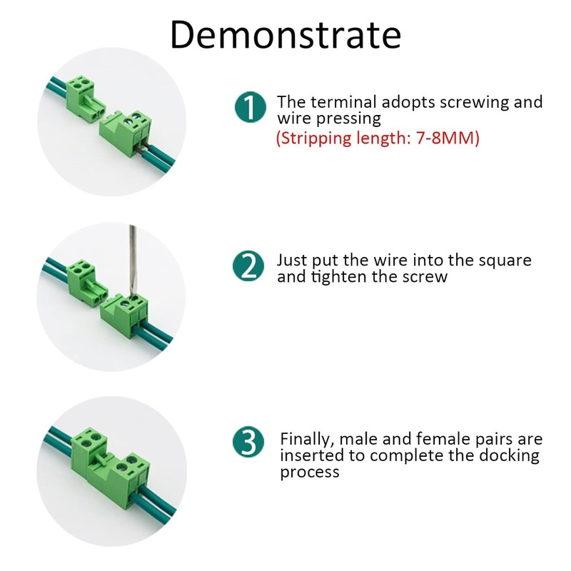 - Wiring range: 24-12AWG (0.511mm-2.05mm), pitch: 5.08mm, stripping length: 7-8mm, working temperature: -40-105°C