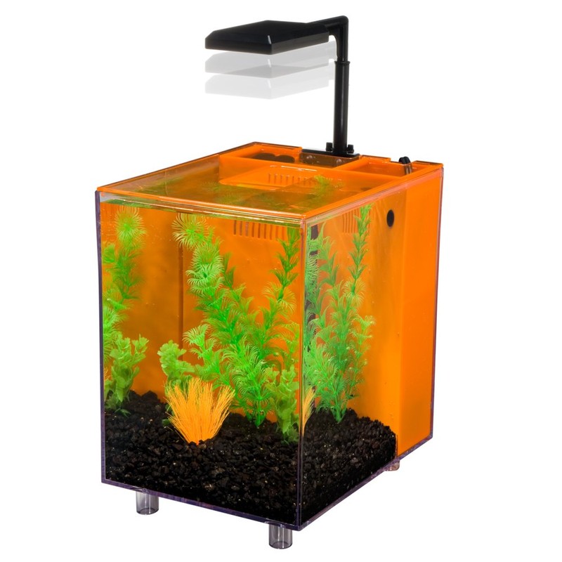- Fish tank has a modern, cube design with a black background and plastic lid.