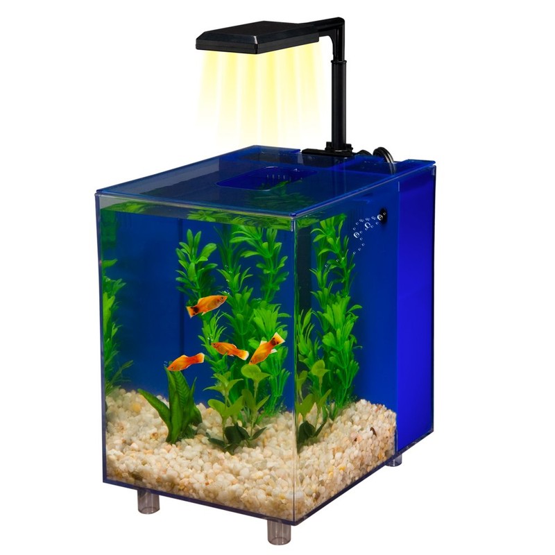 - Aquarium kit includes 2 gallon glass tank, built in water filter, and LED light.