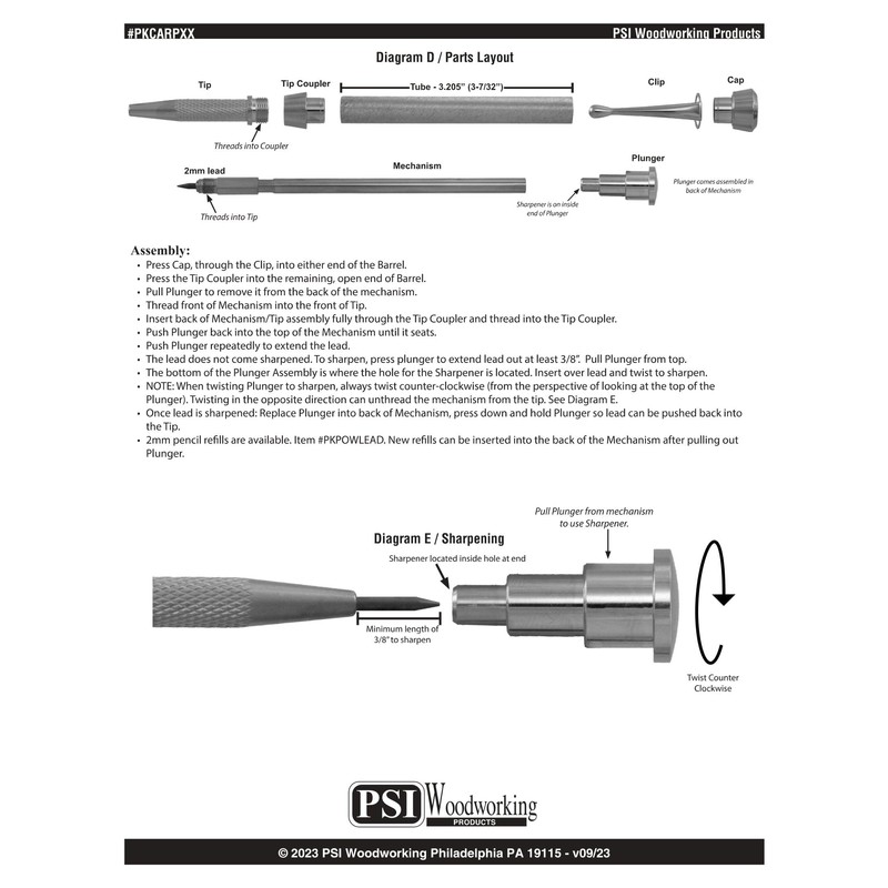 - Built-in sharpener hidden inside the top; Press the end cap to both advance and replace the 2mm lead; Overall finished length after turning and assembly is 5-3/4"