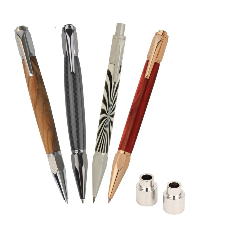 This is a woodturning project kit; Pen hardware and bushing set only; A LATHE IS NEEDED TO 'TURN' INTO FINISHED PENS; Blanks, drill bit, and all other turning tools and supplies are not included. Includes (4) Vertex Click Ballpoint Pen Woodturning Project Kits. You will receive (1) of each in: Chrome (PKFP4000), Gold (PKFP4030), Gun Metal (PKFP4010), and Brushed Satin (PKFP4020). Also includes the bushing set (PKFPBU) needed to make the pens. Features a 3/8" single tube design, a click mechanism, and a Parker style ballpoint black refill. Minimum blank size needed to turn is 3/4" x 3/4" x 3". An easy to make hex shaped pen. Refined, faceted, hexagonal nuts and bolts design. Super quiet, smooth acting click mechanism.
