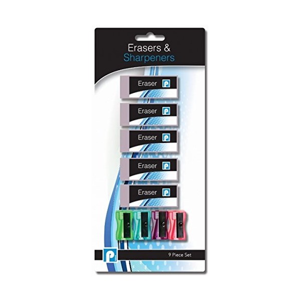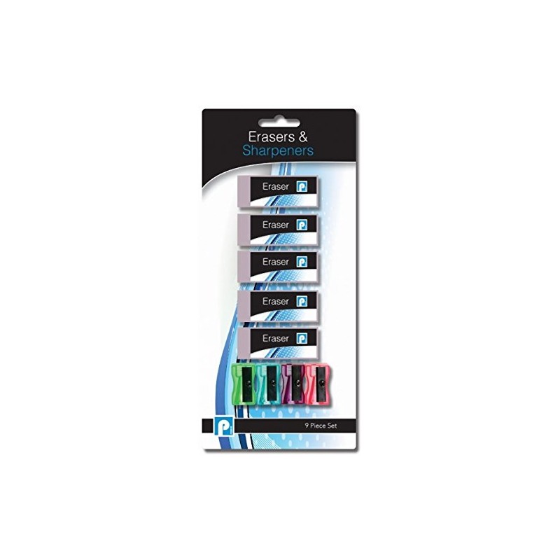- Includes five erasers and four coloured sharpeners