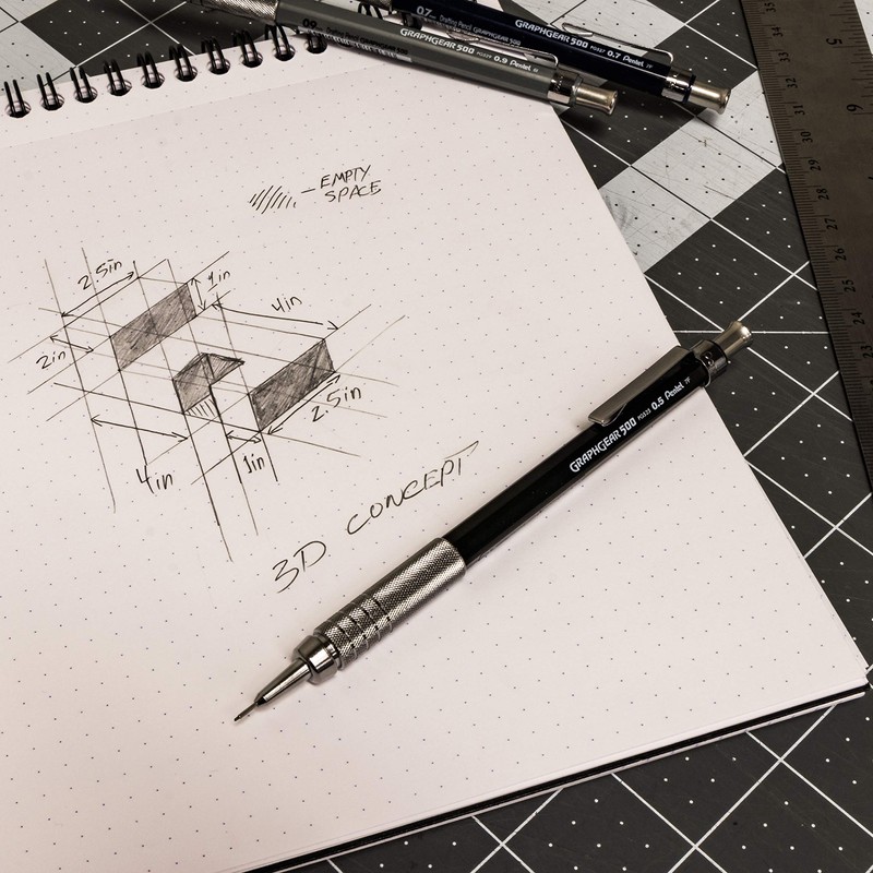 Pentel Graph Gear 500 features a 4mm tip design for rulers and templates. Dual-action retractor protects lead. Built-in lead hardness indicator. Metallic grip with soft, latex-free pads.