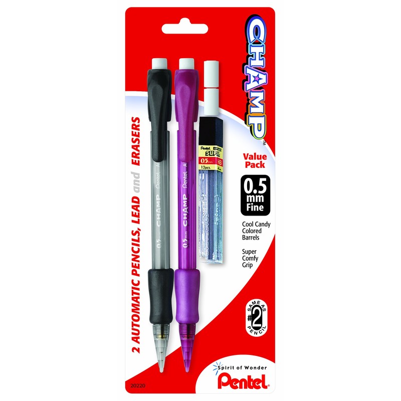 Pentel Champ Automatic Pencil with Lead and 2 Erasers, 0.5mm, Assorted Barrels, 2 Pack (AL15LEBP2)