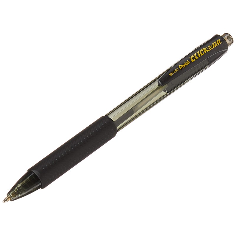 The Pentel® Click-n-Go retractable ballpoint pen provides a great writing experience at a great price. The unique triangular, latex-free grip makes this pen comfortable to hold and keeps your pen from rolling off the desk. A simple click of the plunger quickly advances or retracts the ballpoint tip. Available is a variety of stylish, translucent colors The Click-n-Go comes in a 1.0mm metal tip that writes medium lines.