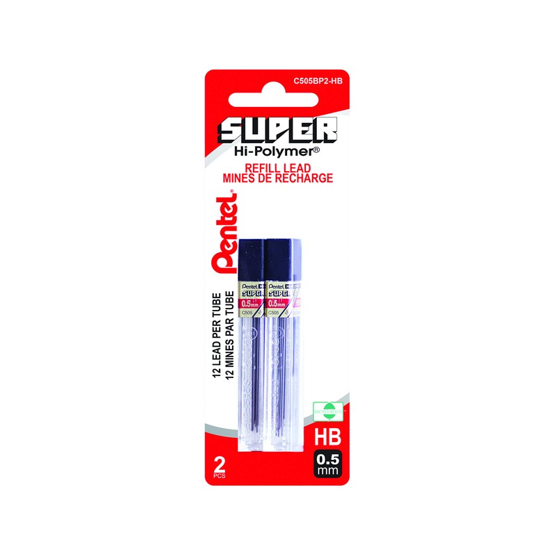 Pentel Hi-Polymer Super Lead Refills for Mechanical Pencils, 12 Leads Per Tube, HB Grade, Standard Lead for Everyday Use, 0.5mm Fine Point, C505BP2-HB, Box of 12