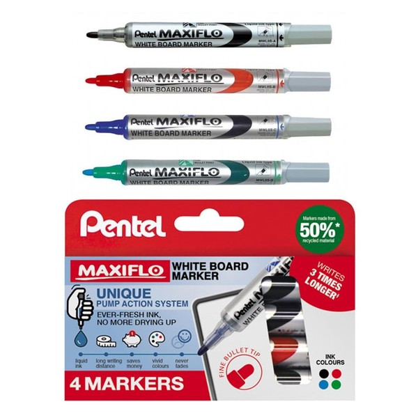 Pentel Maxiflo Whiteboard Marker Fine Bullet Tip (Assorted Pack of 4)