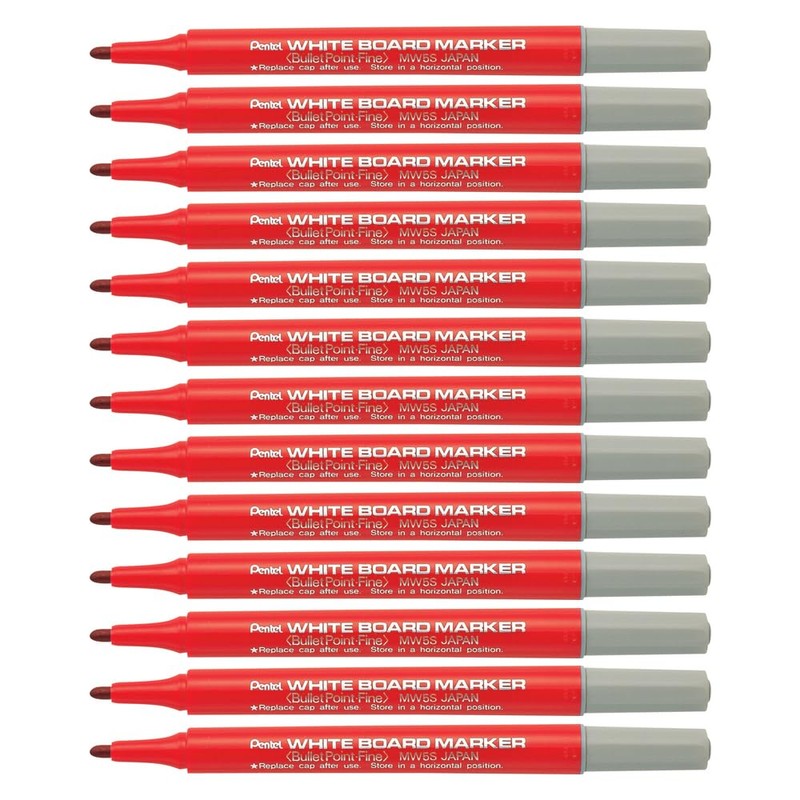 Pentel WhiteBoard Dry Erase Marker, 3.0mm Bullet Point, Markers for Whiteboards, Free of Harmful Chemicals, Red Ink, MW5S-B, Box of 12