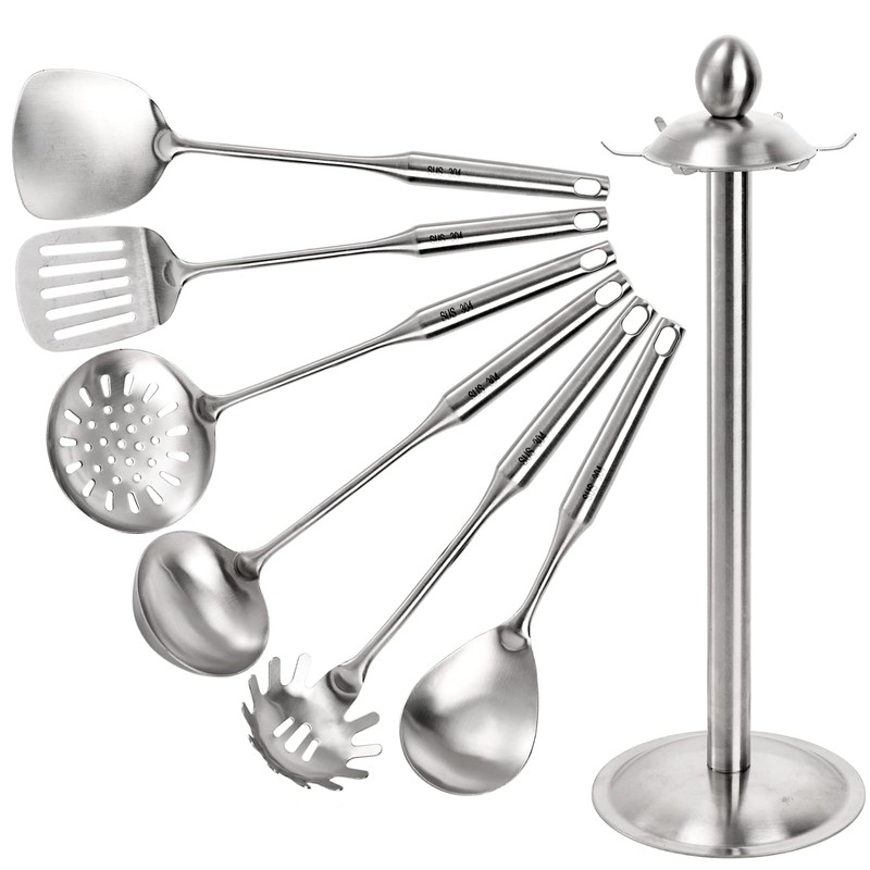 The whole cookware set includes a slotted spoon, slotted spatula, large spoon, soup ladle, spatula , spaghetti server and a 360 degree rotating holder, which has almost covered all the kitchen utensils you usually need to use