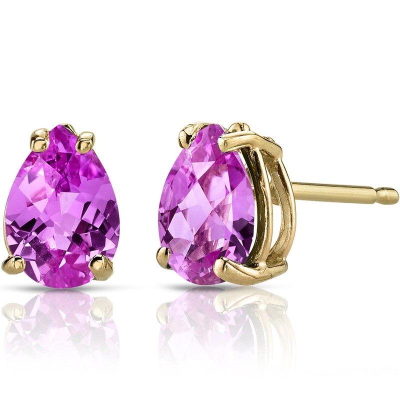 - TEARDROP GOLD STUDS EARRINGS - Stunning and versatile earrings, the Peora 14K Gold Stud Earrings Collection adds a dainty touch of luxury to any style. Featuring Peora Created Pink Sapphire, Pear Shape, 7x5mm, 1.75 Carats total, in its signature Vibrant Pink hue that sparkles in the light for an amazing glow. Set in a classic 4-prong 14K Yellow Gold Earring solitaire style, minimalist earrings are an elegant jewelry must-have. 14K Gold Friction Backs to match.