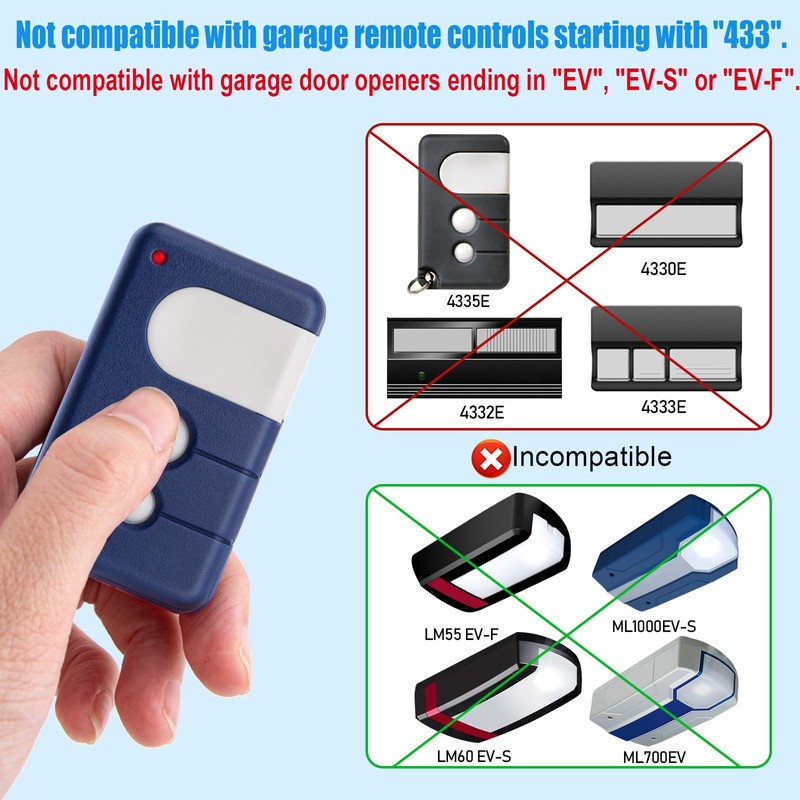 • Important Notes: Not compatible with garage remote controls starting with "433", such as "4335E", "4335EML". Not compatible with garage door openers ending in "EV", "EV-S" or "EV-F", such as "LM700EV", "ML1000EV-S", "ML1000EV-F", etc