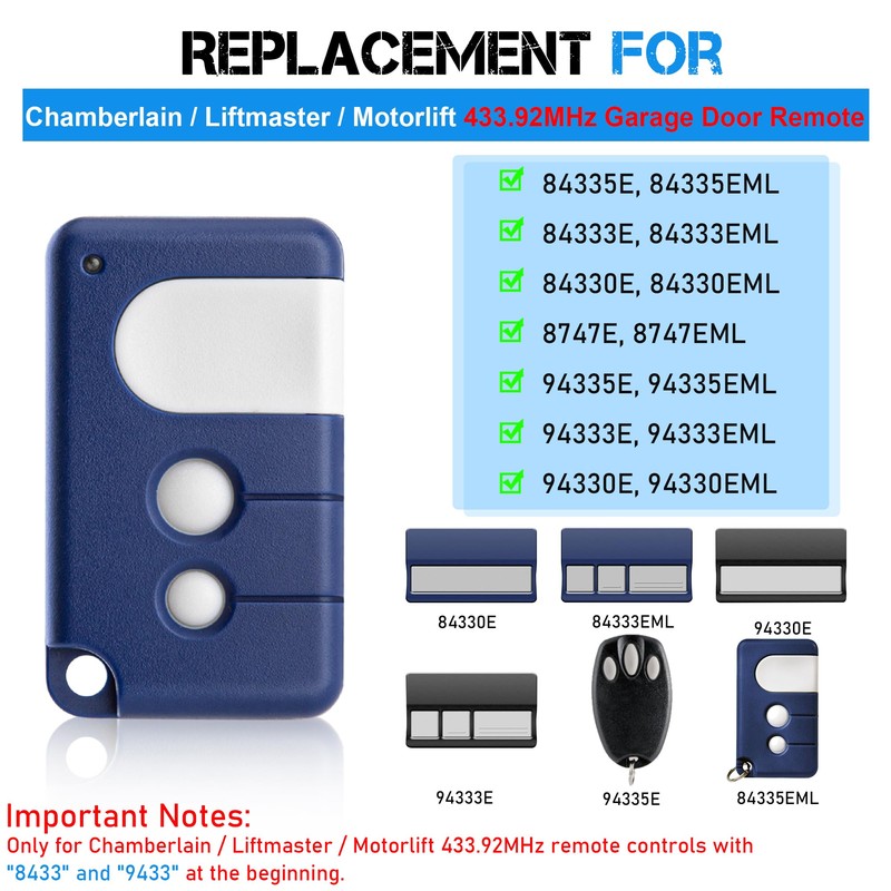 • Compatible Remote Control List: Replacement for Chamberlain Liftmaster Motorlift 433.92MHz Garage Door Remote with "8433" and "9433" at the beginning, such as 84335E/EML, 84333E/EML, 84330E/EML, 94335E/EML, 94333E/EML, 94330E/EML, etc