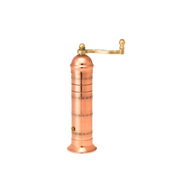 This Atlas 8 inch copper pepper mill is hand made in Greece using the same methods used for the past 300 years with durable all metal bodies and a tool steel grinding mechanism built to last. Atlas mills are the origin of the phrase "pepper grinder", since these mills actually grind the pepper. Common pepper mills only smash the peppercorns, which severely limits the flavor release. The Atlas mill is a unique piece of European tradition that is functionally the best in the world!. Crank will be included inside the item.