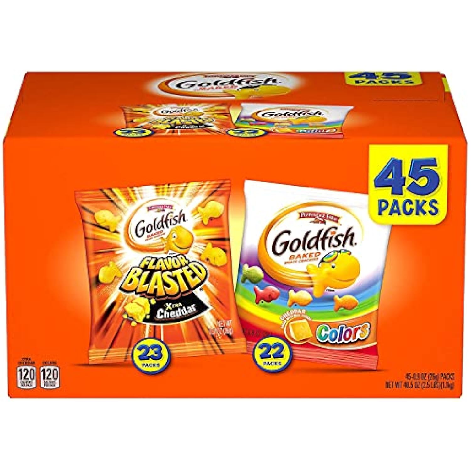 - Variety pack includes: 23 ? 0.9 ounce packs of Xtra Cheddar Flavor Blasted Goldfish Crackers 22 ? 0.9 ounce packs of Cheddar Colors Goldfish Crackers