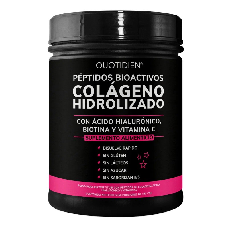 - El colágeno se encuentra en nuestro organismo.Con el paso del tiempo, nuestro cuerpo comienza a disminuir la cantidad de colágeno que produce. Por ende, nuestra piel comienza a debilitarse, lo que da como resultado signos visibles de envejecimiento como arrugas, resequedad y pérdida de tonificación. Colageno Hidrolizado Quotidien aporta los nutrientes que tu piel necesita para lucir más tersa y radiante, y unas uñas fuertes y sanas. Está compuesto con péptidos bioactivos de colágeno hidrolizado, el cual produce más colágeno en tu cuerpo en comparativa del colágeno hidrolizado convencional. Esto ayudará a lucir una piel con mayor elasticidad y las arrugas y líneas de expresión disminuirán notablemente. El ácido hialurónico, biotina y vitamina C son una potente combinación que trabajan en conjunto para actuar desde la primera dosis de empleo para dar los máximos beneficios. Nuestro colágeno hidrolizado tiene increíbles beneficios para que tus uñas recuperen fuerza, grosor y luzca más nutridas. Nuestros Péptidos Bioactivos de Colágeno Hidrolizado es un ingrediente Premium que fue cuidadosamente evaluado, estudiado y seleccionado para aportar los máximos nutrientes desde la primera dosis de empleo. Cada lote de colágeno hidrolizado Quotidien es probado por terceros para asegurar su pureza y potencia. Nuestro colágeno es el resultado de investigación y estrictos estándares de control de calidad. Es efectivo para hombres, mujeres y personas mayores. Nuestro Colágeno Hidrolizado es libre de gluten, lácteos, conservantes, azúcar, colorantes y sabores artificiales. ¡Este colágeno hidrolizado es formulado con ingredientes premium! PÉPTIDOS BIOACTIVOS DE COLÁGENO HIDROLIZADO: En Quotidien utilizamos Péptidos Bioactivos de Colágeno específicamente diseñados para estimular la producción de colágeno y para mejorar nuestra piel, cabello y uñas. Este suplemento combina Péptidos Bioactivos de Colágeno Hidrolizado, BIOTINA, Vitamina C y Ácido Hialurónico. Cuida tu piel desde adentro y lleva tu rutina de cuidado facial al próximo nivel. INGREDIENTES SELECCIONADOS: Seleccionamos y combinamos ingredientes para brindar una fórmula completa. Este producto contiene Péptidos Bioactivos de Colágeno Hidrolizado con VITAMINA C:Ingrediente clave para potenciar la absorción del colágeno y ácido hialurónico.ÁCIDO HIALURÓNICO:Retiene grandes cantidades de agua en la piel e hidrata profundamente. BIOTINA:Fundamental para el fortalecimiento de la piel y uñas. La belleza es natural, y lucir radiante de adentro hacia afuera es nuestro objetivo.