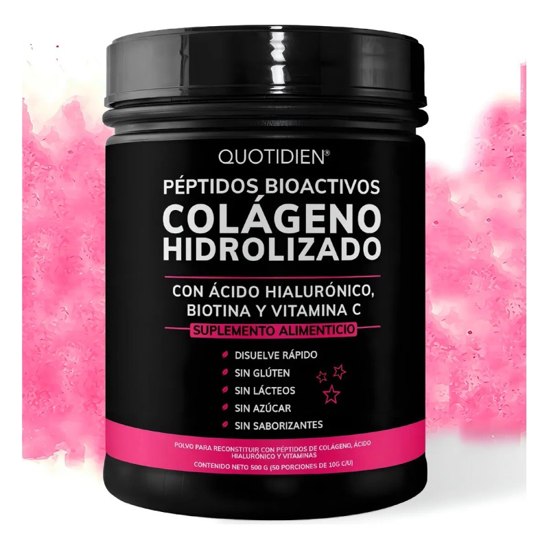 Colageno Hidrolizado Quotidien aporta los nutrientes que tu piel necesita para lucir más tersa y radiante, y unas uñas fuertes y sanas. Está compuesto con péptidos bioactivos de colágeno hidrolizado, el cual produce más colágeno en tu cuerpo en comparativa del colágeno hidrolizado convencional. Esto ayudará a lucir una piel con mayor elasticidad y las arrugas y líneas de expresión disminuirán notablemente.