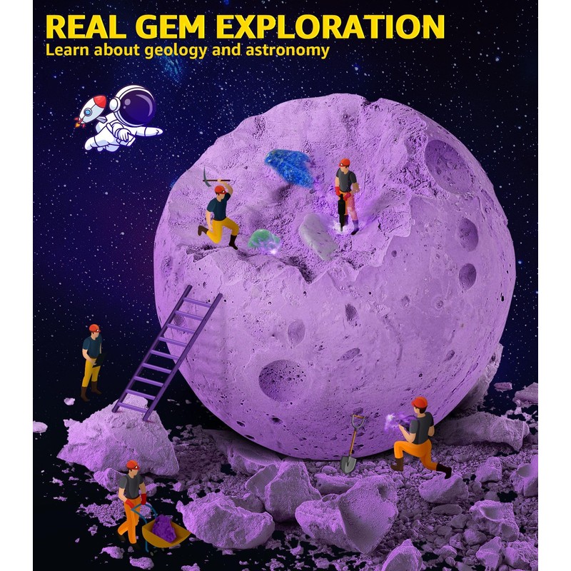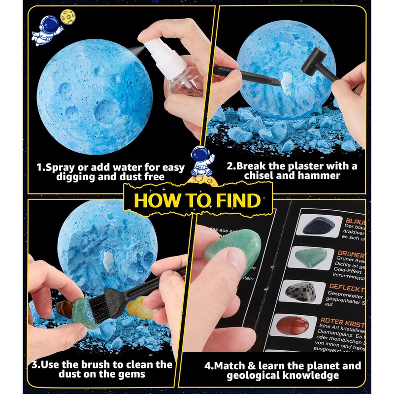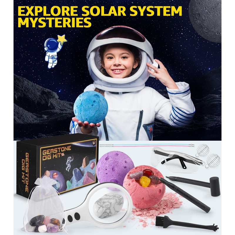 - Discover the treasures of the solar system: Immerse yourself in the exciting thrill of excavation. Our excavation kit for children invites children to discover and excavate 15 real gems and crystals, making geology an exciting adventure right at home. Awakens curiosity about the wonders of the earth and conveys knowledge of geology, gemstones and archaeology
