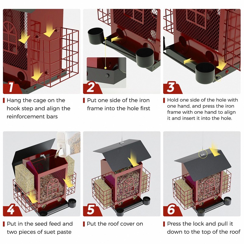 - Versatile Feeding: Fill the cage with various seeds to cater to different bird species. Woodpeckers will love the suet cage, while four cups can provide water or hold smaller seeds, attracting a variety of feathered visitors to your outdoor space