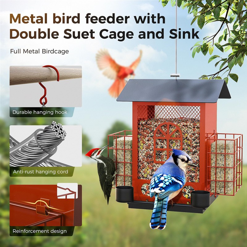 PerchMe® Bird Feeders for Outdoors Hanging, Metal Bird House Feeder with 2 Suet Cage and 4 Water Cups,Large Capacity,Weatherproof,Easy to Clean & Refill-Red