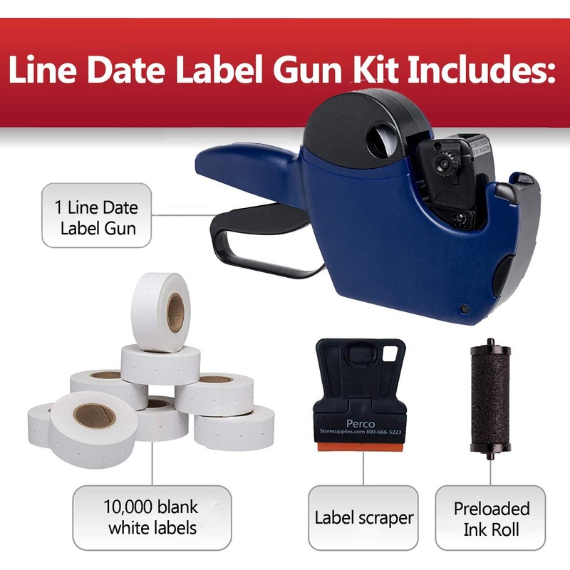 Perco Pro 1 Line Date Label Gun Kit, Includes 8 Digits Date Gun Labeler, 10,000 Plain White Labels, and Preloaded Inker