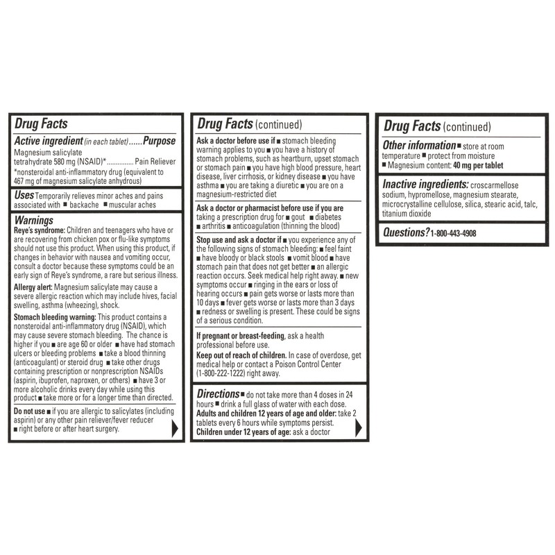 - Magnesium salicylate, the key ingredient in Percogesic Backache Relief, is a nonsteroidal anti inflammatory drug (NSAID) that reduces back and muscular aches