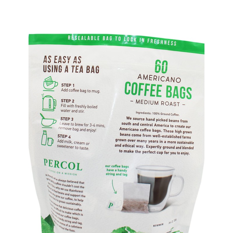 - Percol Americano Medium Roast Coffee Bags contain hand picked high-grown beans from well-established farms in South and Central America grown over many years in a more sustainable and ethical way.