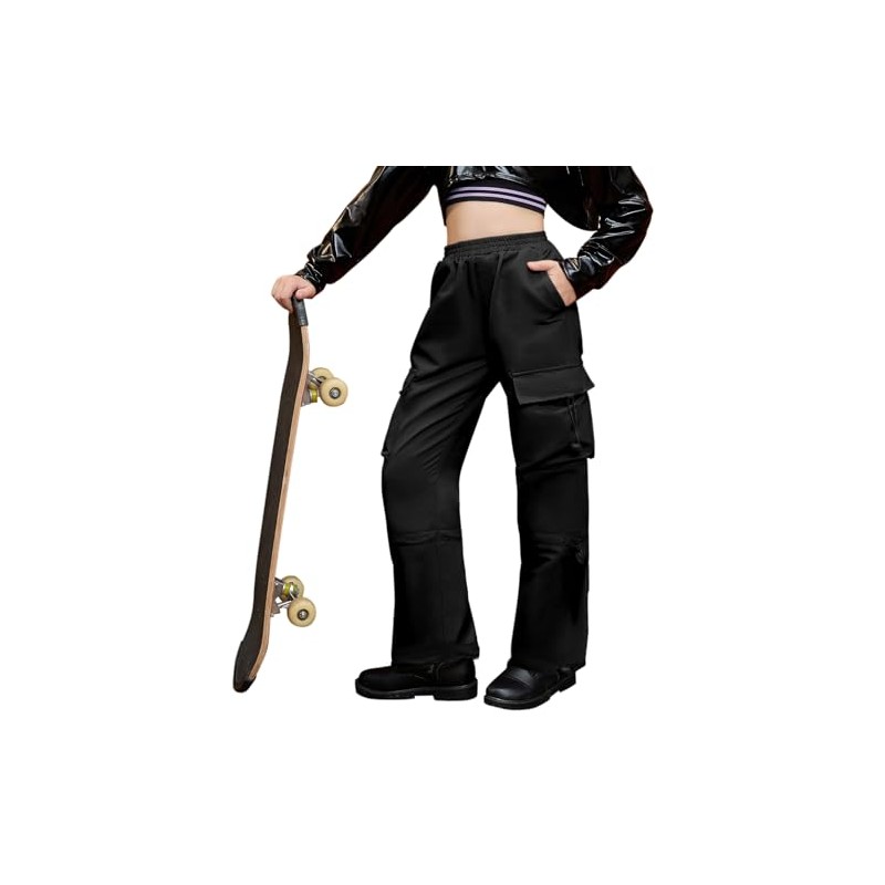 Perfashion Parachute Pants for Girls Cargo Pants Black Wide Leg Teengirls Dance Outfitts Size 12 13