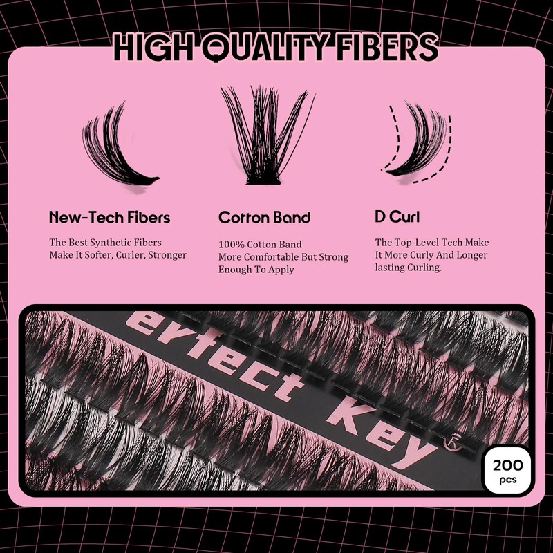 - This cluster eyelash extension is designed with a thin cotton band and soft synthetic fibers developed with the latest technology that make them ultra-comfortable for extended wear. Featuring 200 clusters of featherlight lashes that go under your own lashes, so the bands aren't visible. Every wispy lash cluster has 80 pcs of eyelashes which make them very fluffy but natural. Special synthetic fibers and curling technology make them long-lasting curling and waterproof.