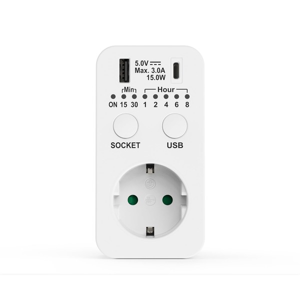 Perfect Socket Timer, Timer 230 V, Countdown Switch Socket, Timer Socket with USB and USB C Connection, Timer Socket Programmable, Timer Switch, White