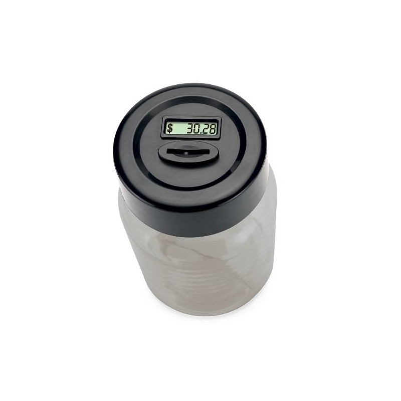 - Plastic money jar with digital display, showing the total amount accumulated.
