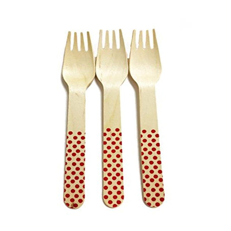 Perfect set for parties, picnics, or any other celebrations. Made from smooth birchwood. Each package includes 36ct of 6.5" Forks with Red Polka Dot Pattern.
