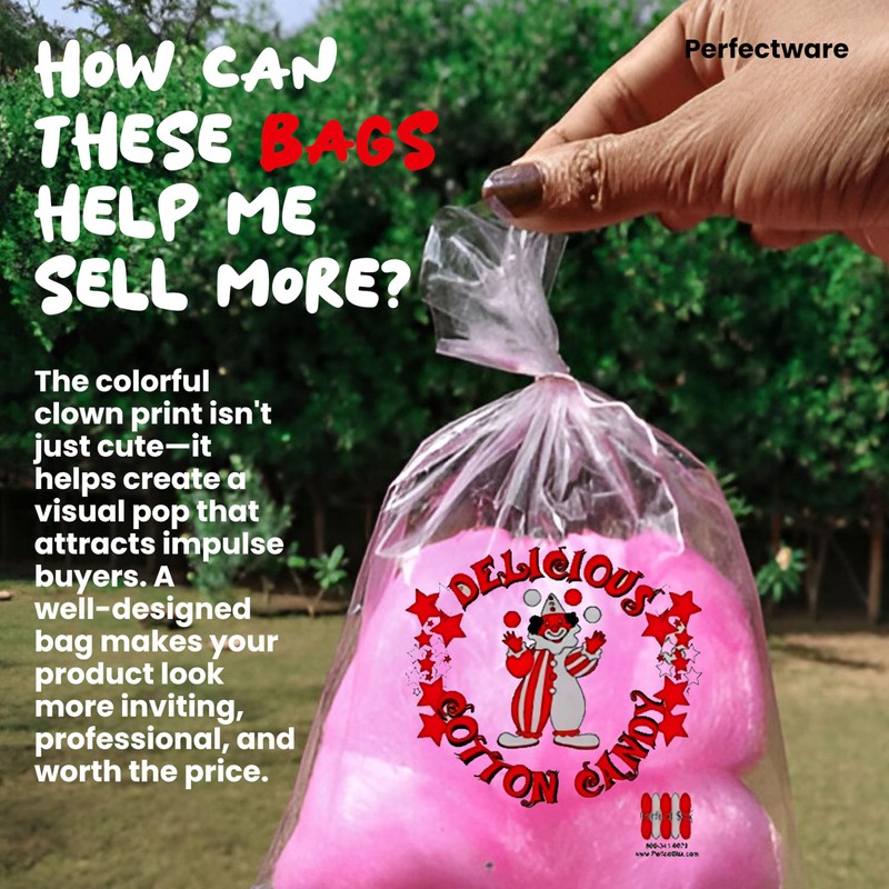 Perfectware Cotton Candy Bags with Clown Design. Includes Twist Ties- Pack of 100ct